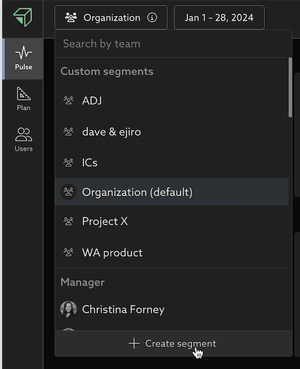 By default, Uplevel shows data about everyone in your organization, but offers a list of default segments you can pick from to see more detailed groups.