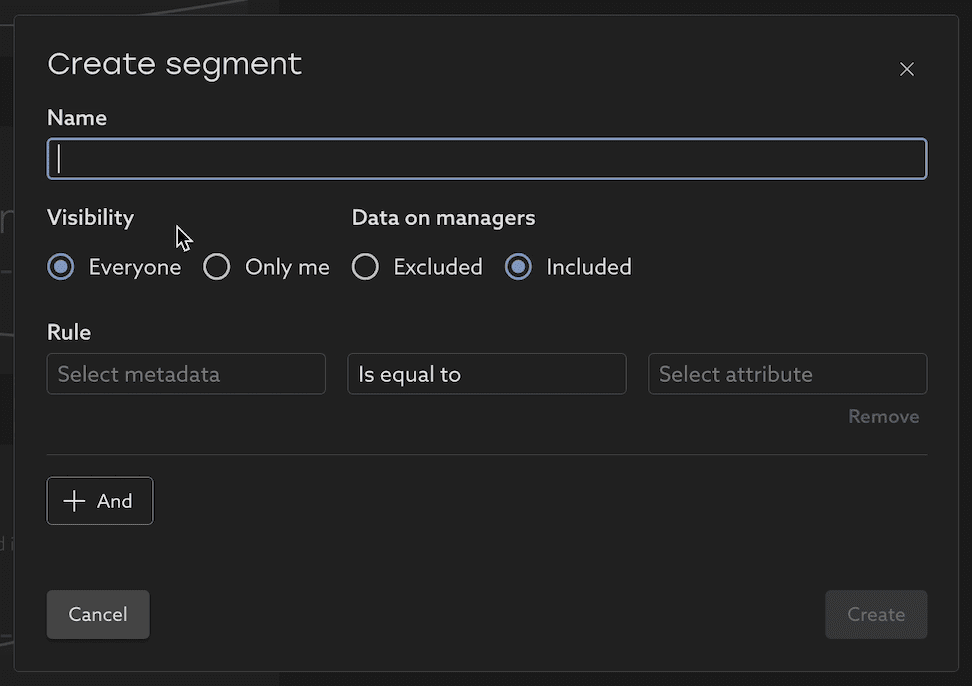 - At this point you can decide whether this segment should be available to everyone or only to you, whether managers should be included in your segment, and if the segment should include former employees as well as current ones.