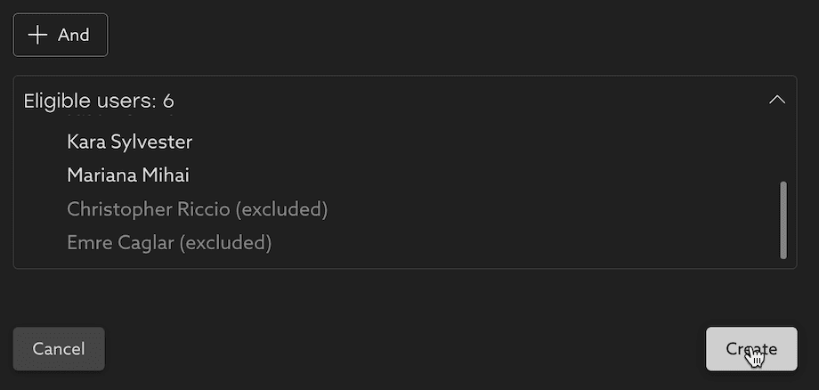 - Finally, Eligible Users shows the number of people in the segment you're creating, and expand to review the list.