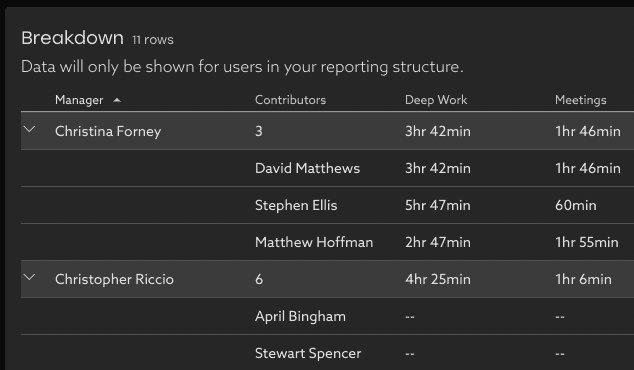 ICs and managers are able to dive into the details to support the individuals most impacted by high meeting load and interruptions.