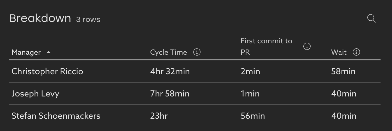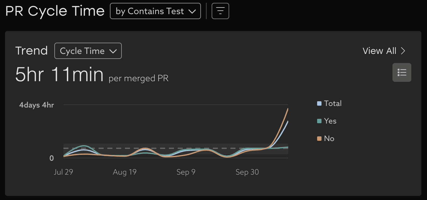 - The trend chart is now broken down into a trend of Cycle Time for PRs that contain tests, PRs that don't contain tests, and a Total trend for all PRs.