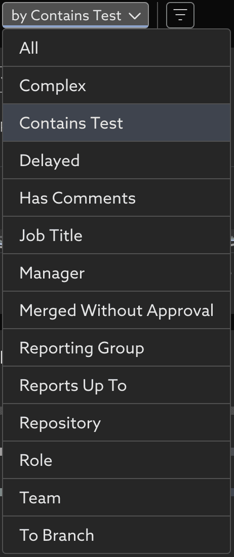 - Select a new property to group the data. In this case we are looking at PR Cycle Time, and so the options available are properties of the PRs, or the people who opened the PR. Select "Contains Test."