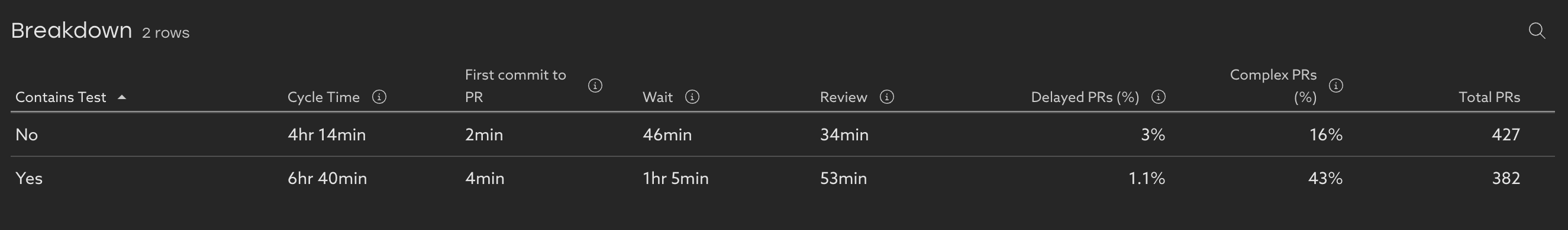 - The breakdown table shows a separate row of data for the PRs that contain tests, and PRs that don't contain tests.
