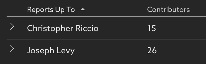 Group by "Reports Up To" to see all the individuals who report to a leader in the organization. Note that individuals will be in multiple groups in this view, as they report up to their Director, VP, CEO, etc.