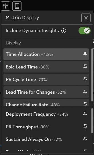 By default, Metric Trends highlight the insights with the largest recent change. Use the Options menu to pin any insight so it always appears.