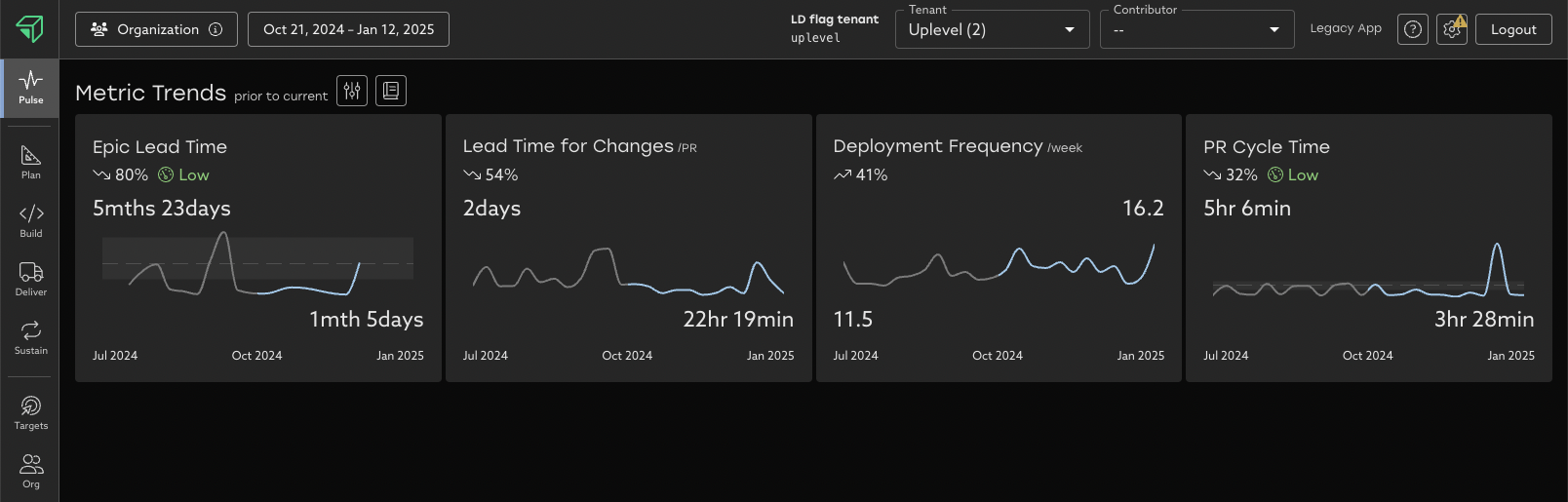Metric Trends on the Pulse Page highlight the insights with the largest recent change, to highlight where focus is needed, and where efforts to improve are showing the biggest impact.