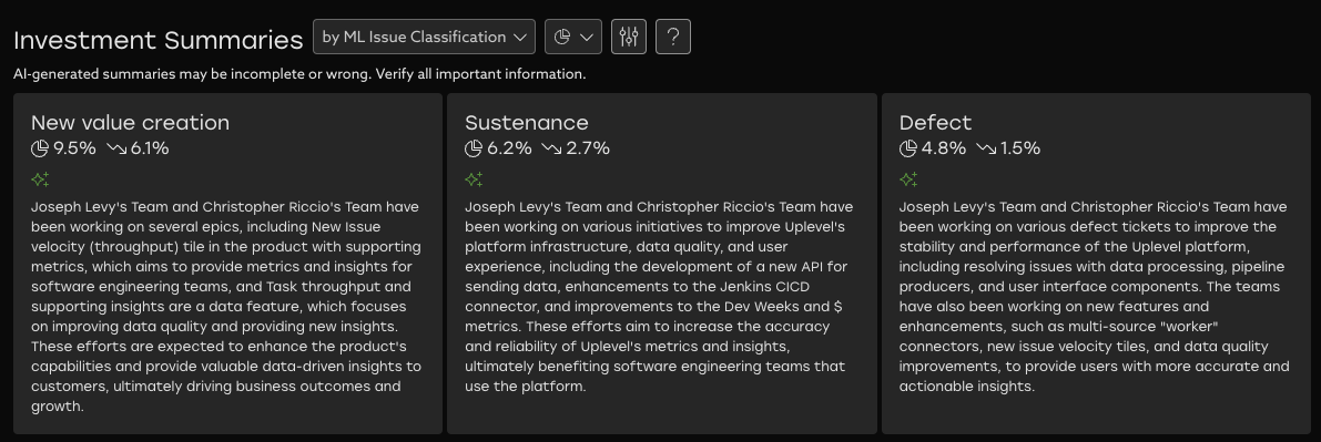 Investment summaries are generated by leveraging Jira/ADO issue metadata with a privately running LLM (Large Language Model). The LLM runs on Amazon Bedrock, and data sent is not stored, used for training, nor shared with any third parties. As with all AI products, these descriptions may be incomplete or wrong. Please verify all important information.