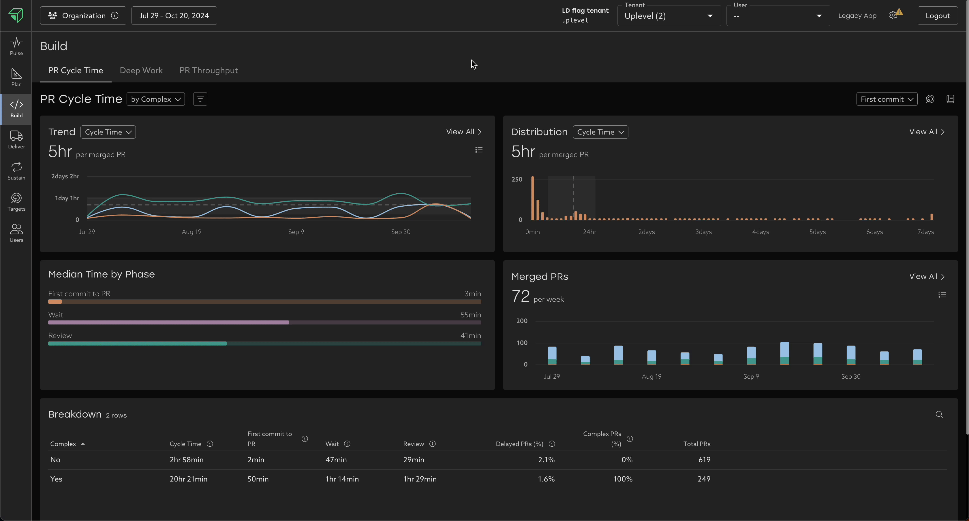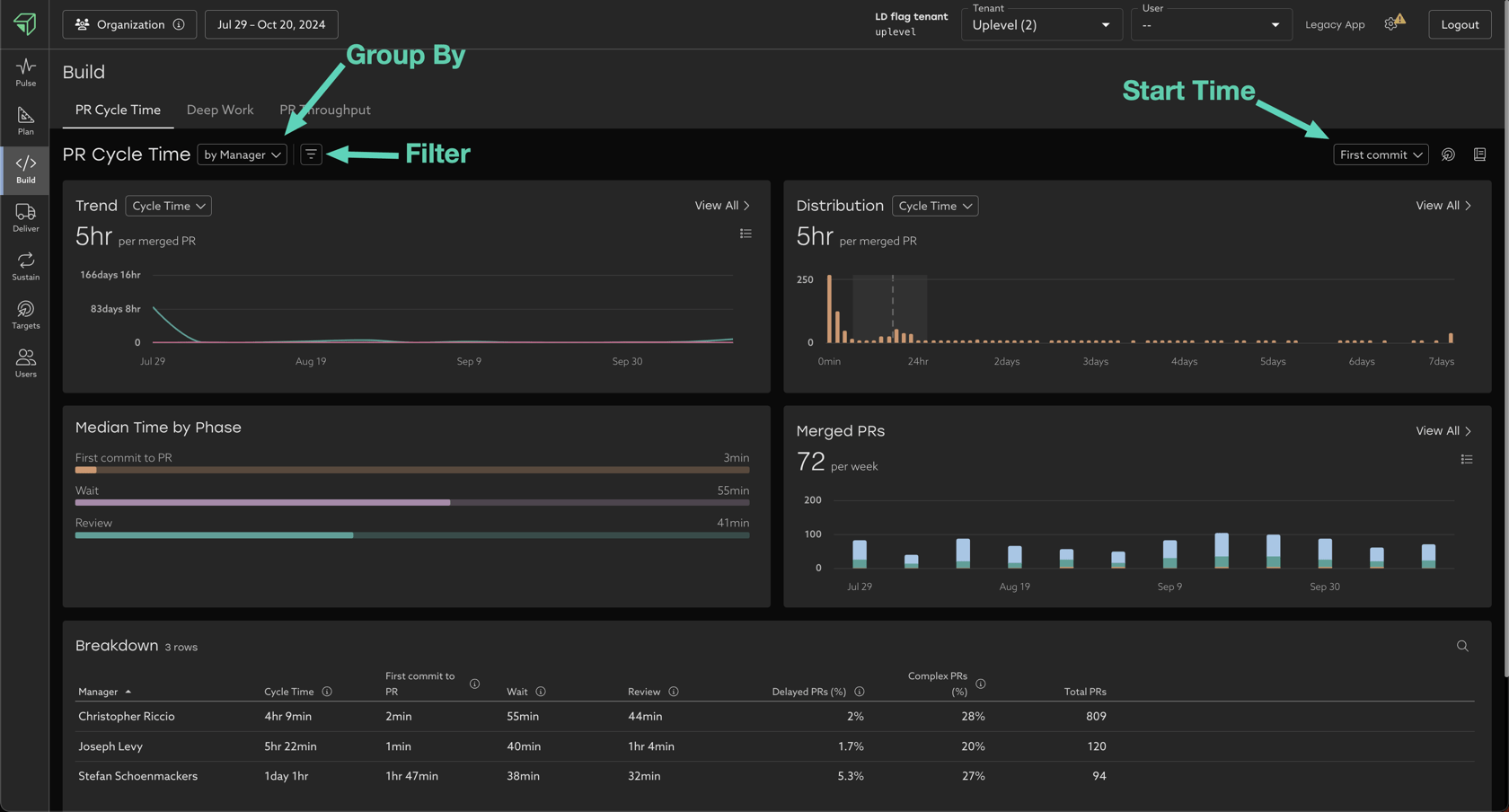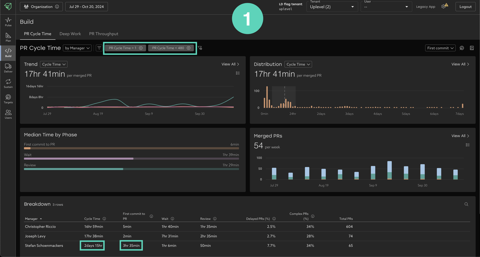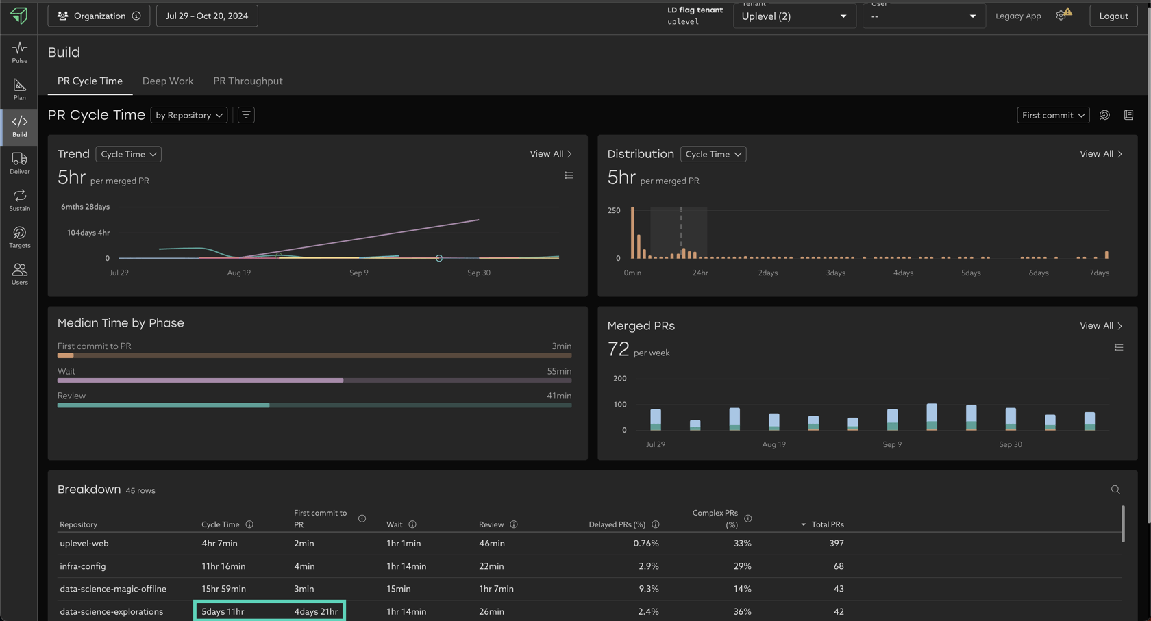 Uplevel's Build Tab provides a drill-in experience for Code/PR velocity. Let's use it to find some opportunities for improvement below.