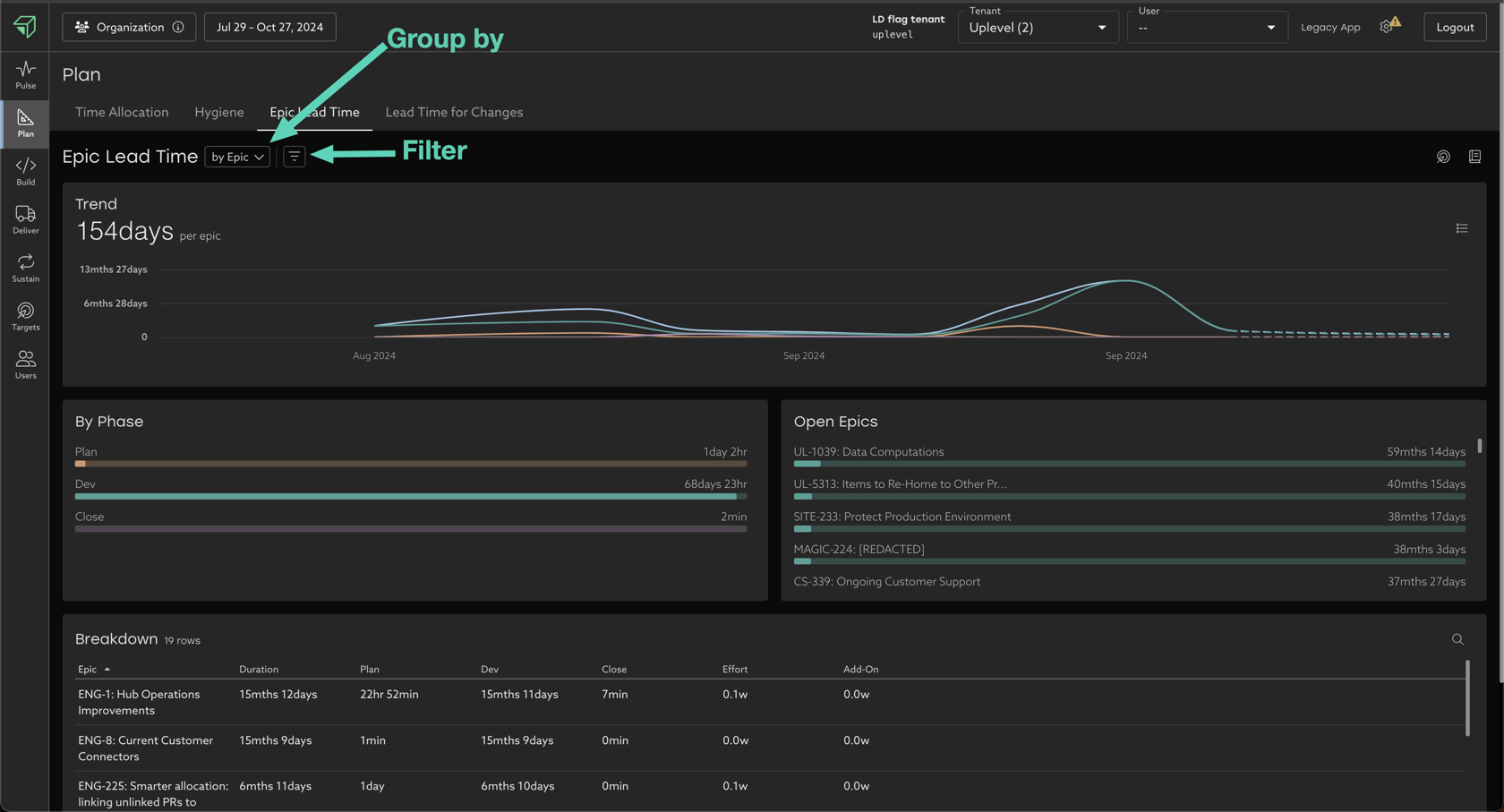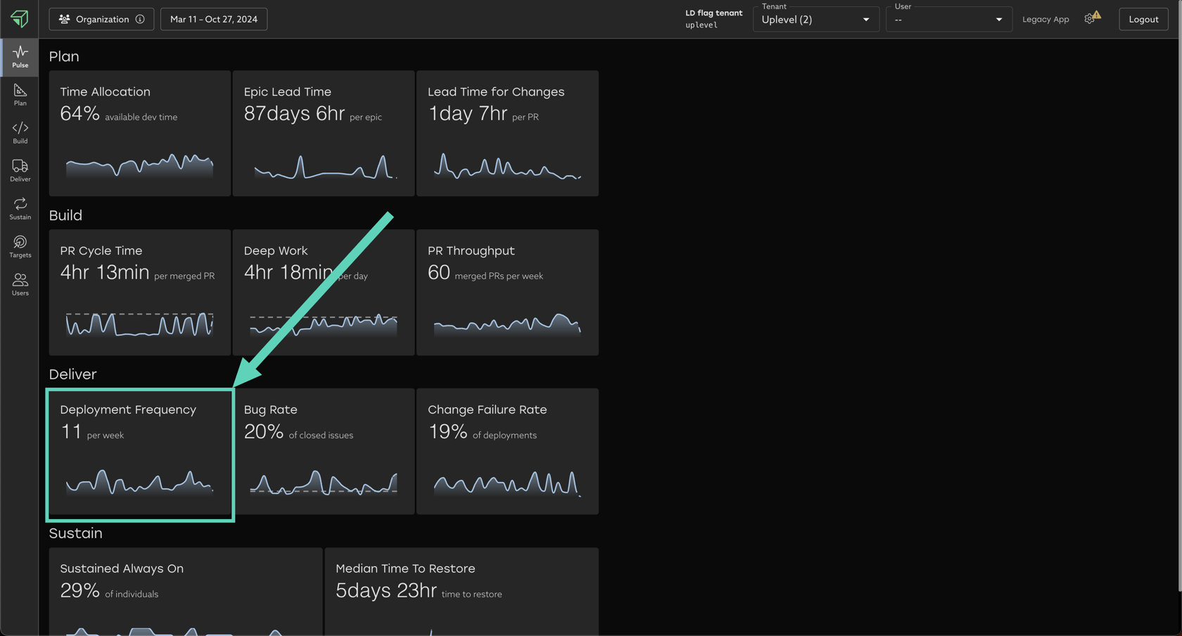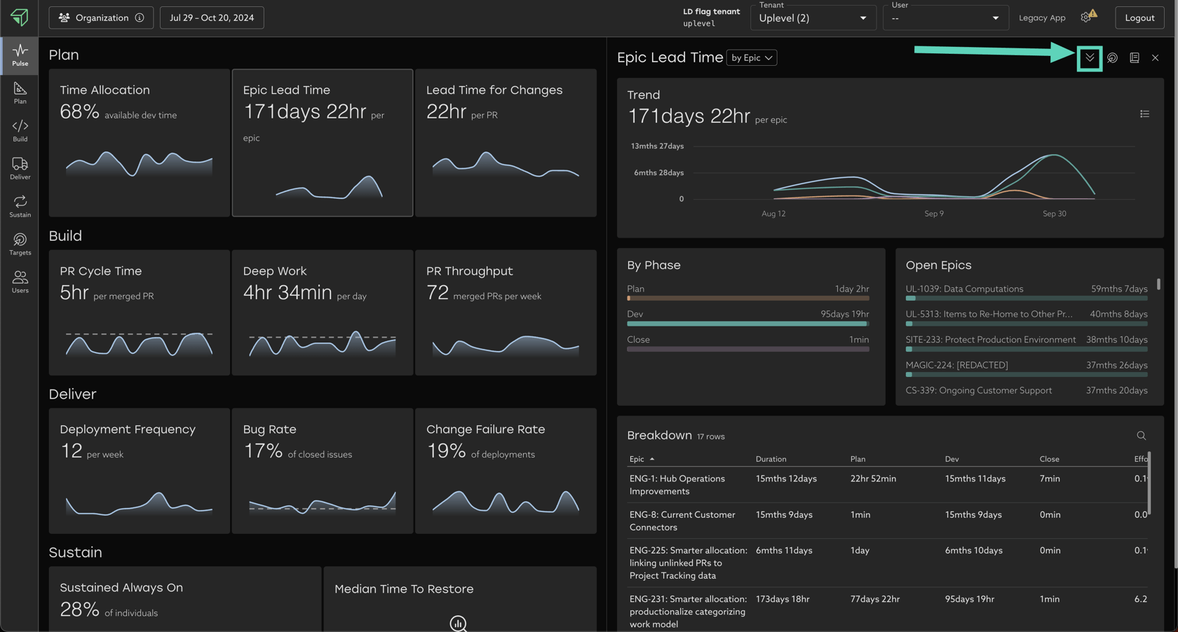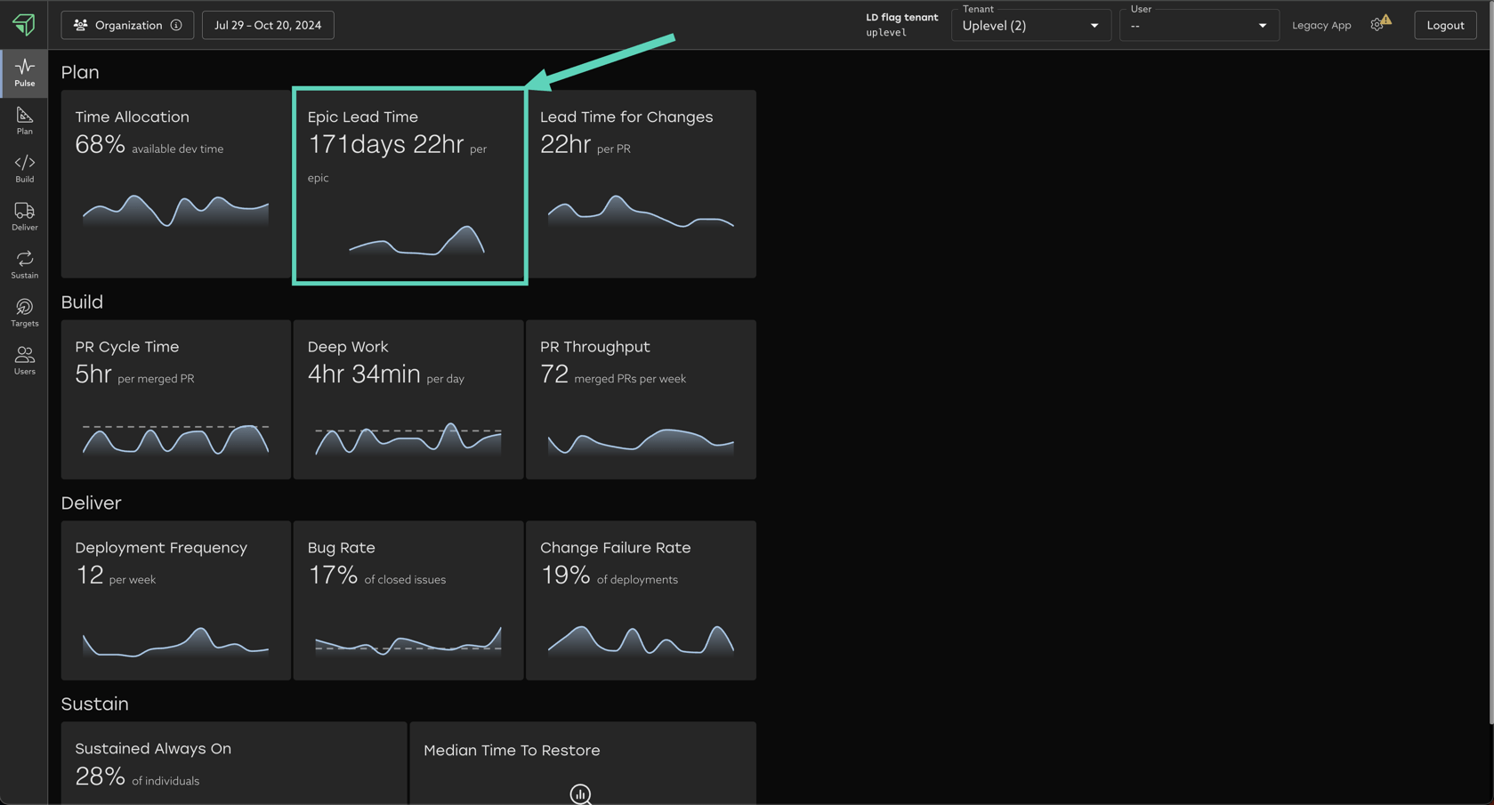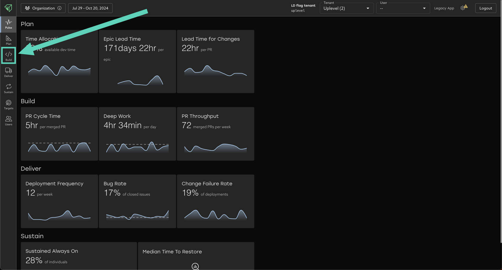 Uplevel's Build Tab provides a drill-in experience for Code/PR velocity. Let's use it to find some opportunities for improvement below.