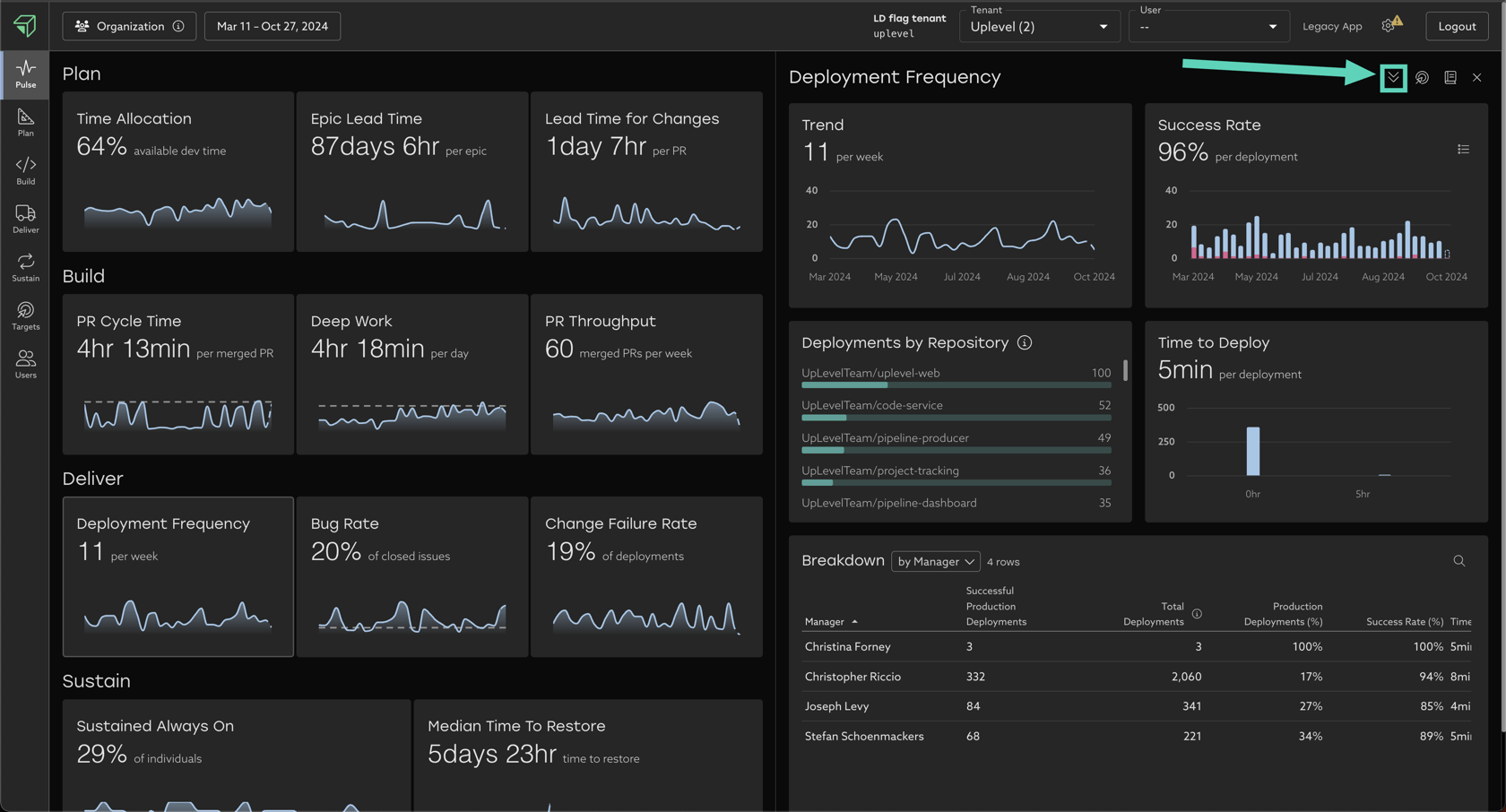 There are no toggles/filters/group by options in Deployment Frequency today. Identical to the examples above, you can explore the Breakdown table at the bottom of the drill-in page to look for unevenness across teams.